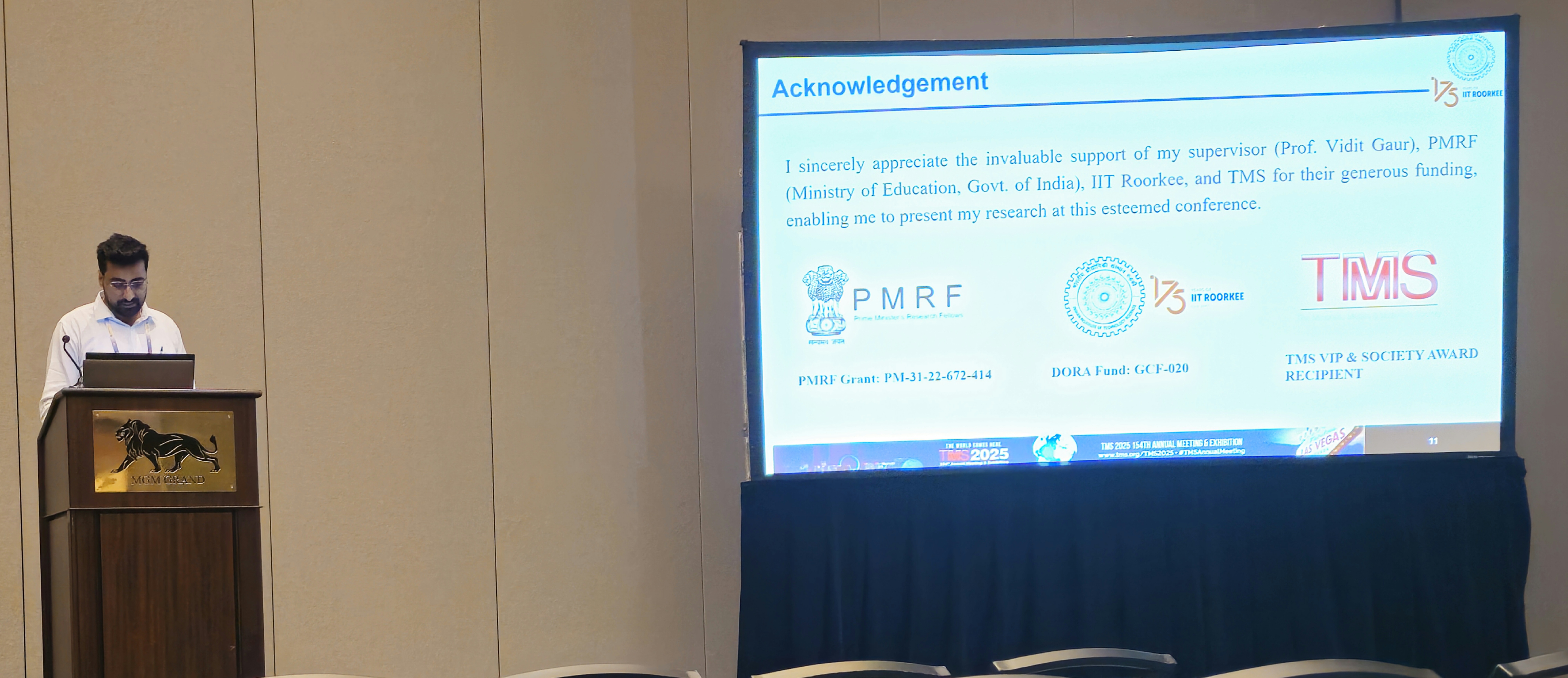TMS 2020, 149th Annual Meeting & Exhibition (February 23-27, 2020, San Diego, California, USA) "Thank you IITR for providing me the opportunity to have an experience of a lifetime. Since the start of my Ph.D. in IIT Roorkee, I had a dream to attend a conference in the USA to present my research work. As I set my timeline, I was lucky enough to submit my Ph.D. dissertation on 06th December 2019. So, I was totally geared up for the oral presentation. The experience to fly to the USA and delivering the oral presentation to the international community was exhilarating. The partial funding provided by DORA, IITR helped me in making my travel itinerary look like a cakewalk. It is an experience which many students from the campus should not miss out on. Thank you once again DORA, IITR."
